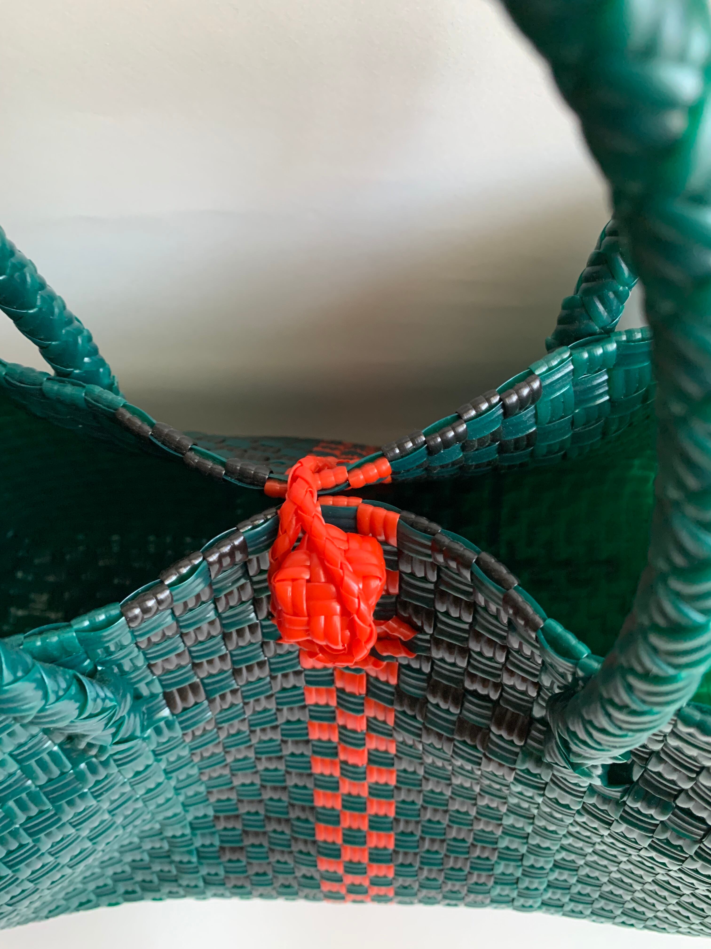 再生プラスチック手編みバッグは、柔らかい肌触りですが強度や耐久性にも優れています。水や汚れにも強く、プラスチック廃棄物をリサイクルしたエコな素材であり、インドネシアの地元職人さん達の支援にも繋がっています。丁寧に作られたオリジナルの編み込みデザイン。鮮やかなカラーバリエーションも魅力です。