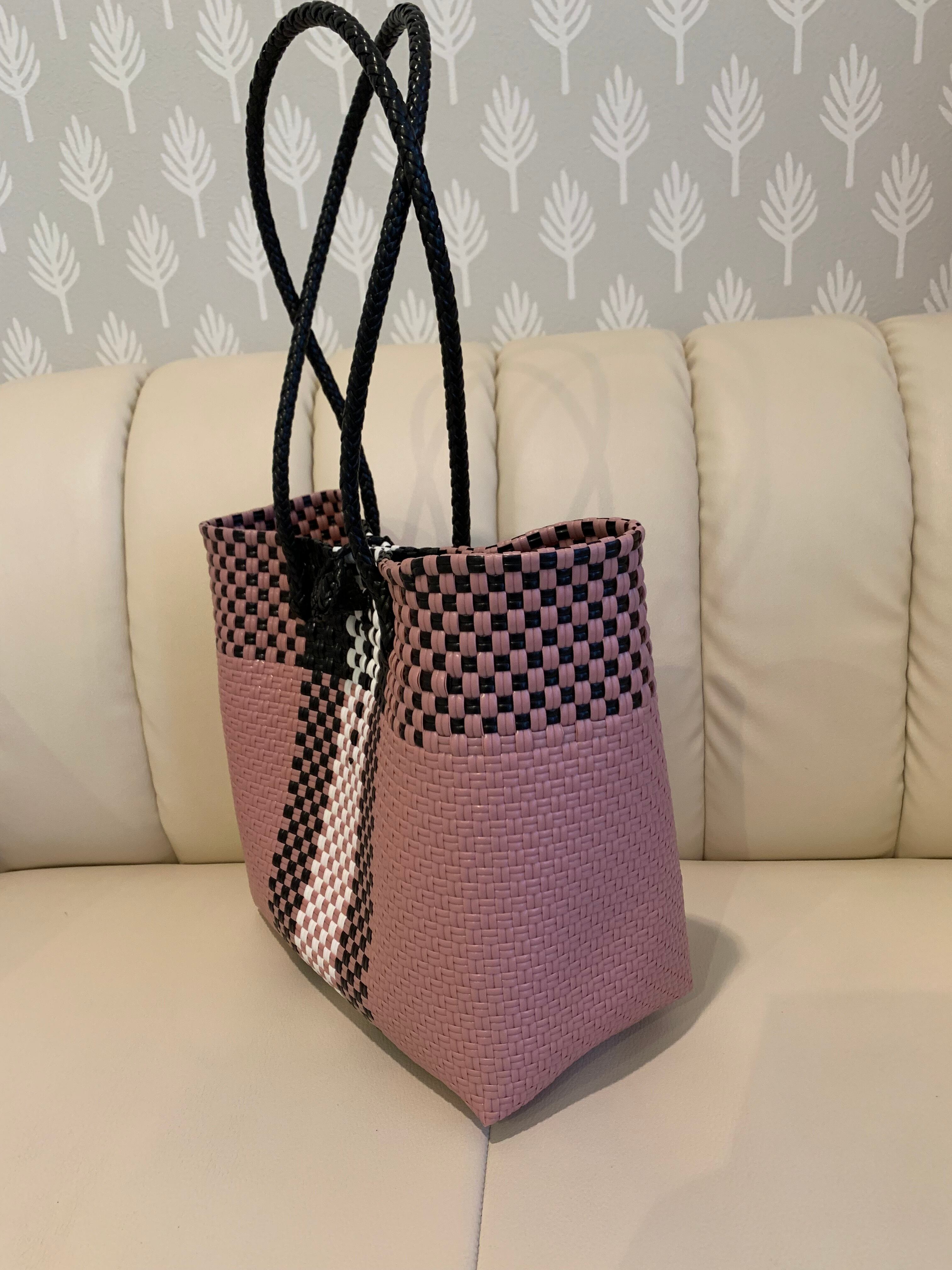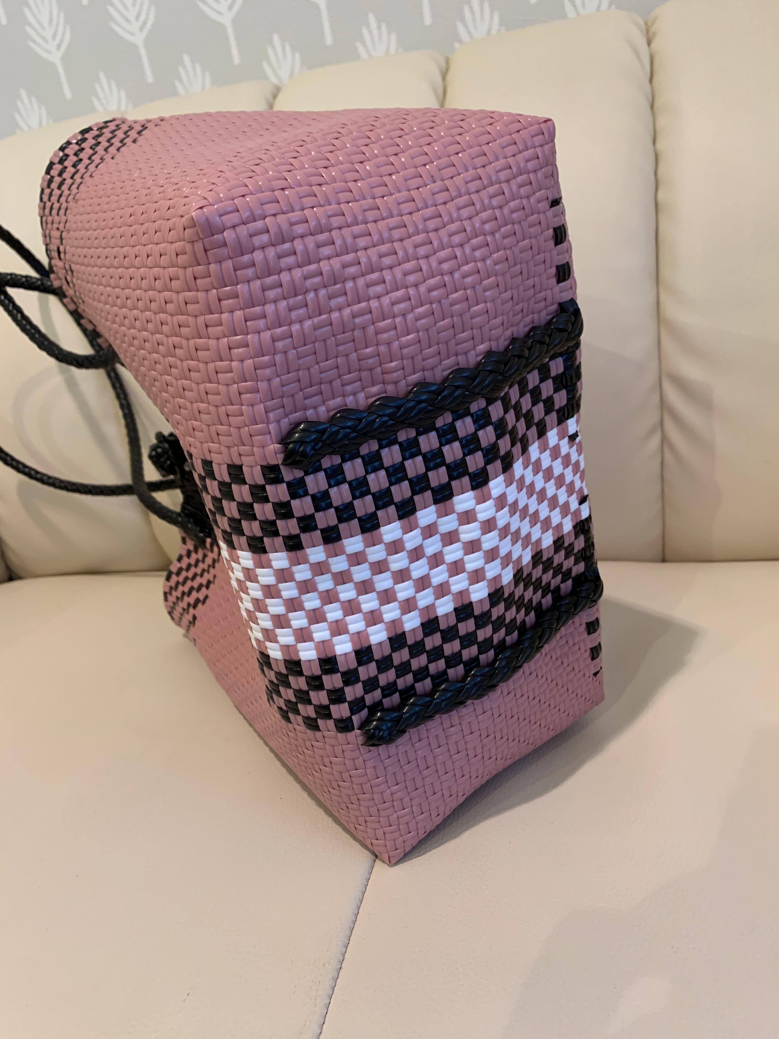 再生プラスチック手編みバッグは、柔らかい肌触りですが強度や耐久性にも優れています。水や汚れにも強く、プラスチック廃棄物をリサイクルしたエコな素材であり、インドネシアの地元職人さん達の支援にも繋がっています。丁寧に作られたオリジナルの編み込みデザイン。鮮やかなカラーバリエーションも魅力です。
